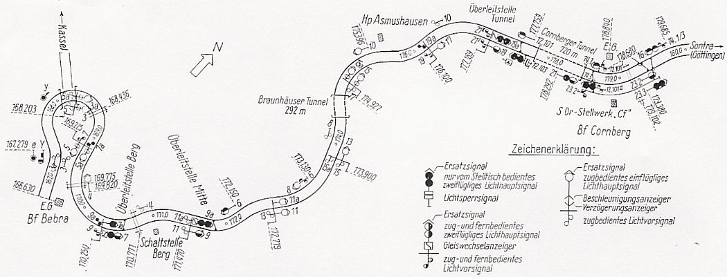 Zwischen Bebra und Cornberg gab es folgende Betriebsstellen vor dem Gleiswechselbetrieb: Bebra - Bk Heidau - Bk Berg - Bk Gilfershausen - Bk Asmushausen - Cornberg. Cornberg besaß zu dieser Zeit 3 mechanische Wärterstellwerke (Cs, Cm, Cn) sowie die Befehlsstelle (Fdl) im Empfangsgebäude. Der Tunnel in Cornberg war aufgrund seiner Länge mit in den Bahnhof einbezogen. Da die Leistungsfähigkeit dieses Streckenabschnittes durch die vorhandene Infrastruktur damals nicht die beste war, sann man nach Lösungen, diese zu verbessern. Bei größeren Störungen in diesem Bereich war nämlich oft eine Umleitung über Kassel notwendig. So entstand für das Jahr 1949 dadurch eine Personalkostenvermehrung von 570.000,- DM, wie man damals anhand der Auswertung der Unregelmäßigkeiten von den ZÜ-Blättern der Zug-Überwachung ermitteln konnte. Welche Möglichkeiten hatte man aber damals, um die Betriebsabwicklung zu verbessern und deren Kosten zu senken? Zum einen bestand der Plan, unter Ausnutzung der damaligen Stellwerkstechnik etwa bei der Bk Berg noch ein Überholungsgleis in Bergrichtung anzulegen. Die Geländeverhältnisse ließen dieses dort nämlich zu. Hiervon nahm man aber Abstand, da zum einen der Neubau eines zusätzlichen Stellwerk notwendig wurde und das Personal für diese Strecke dann hätte erhöht werden müssen. Dies hätte zu einer Kostenvermehrung beigetragen. Auch wäre durch diese Maßnahme nur eine Steigerung der Leistungsfähigkeit um 30 % eingetreten. Eine weitere Möglichkeit war die Anwendung der neuen Signaltechnik damals. Durch Einsatz des Selbstblocks konnte die Leistung der Strecke um 90 % erhöht werden und es war zudem auch kostengünstiger, da die alten Stw und deren Personal eingespart werden konnten. Ohne Bebra mitzurechnen, waren bei der alten Technik insgesamt 11 Personen für die Durchführung einer Zugfahrt bis nach Cornberg notwendig. Etwa im Jahr 1950 wurde daher mit dem Bau des Dr-Stw Cf in Cornberg begonnen, welches dann am 7. Mai 1951 in Betrieb genommen wurde. Bis zur Inbetriebnahme der Fernsteuerung für den gesamten Bereich des Fahrdienstleiters in Cornberg dauerte es dann noch bis zum 8. Oktober 1951. Für die Durchführung des Gleiswechselbetriebes war der Fdl in Cornberg allein verantwortlich, da nur er allein konnte anhand der Ausleuchtungen seines Stelltisches beurteilen, ob und wann ein Gleiswechselbetrieb möglich war. Selbst der ZÜ-Beamte hatte ihm gegenüber diesbezüglich keine Weisungsbefugnis. Da in Bebra die Gleise des Güterbahnhofs sich in Fahrtrichtung Norden (Göttingen, Kassel, Hannover, ...) links von denen des Personenbahnhofs befinden, besteht die Möglichkeit, einen Güterzug und einen Personenzug gleichzeitig ausfahren zu lassen, den langsameren Güterzug auf dem linken Streckengleis, den schnelleren Personenzug auf dem rechten Streckengleis. An mehreren Stellen auf der Strecke zwischen Bebra und Cornberg kann der langsamere Güterzug wieder auf das rechte Gleis zurück fahren, wenn ihn der schnellere Personenzug überholt hat, um das Gegengleis wieder für talwärts fahrende Züge frei zu geben. Am 22. März 1982 ist jedoch auch für den Fdl in Cornberg Dienstende. Ab diesem Datum wird die Strecke ab Bebra bis einschließlich Bahnhof Sontra vom Fdl Bpf (Bebra Personenbahnhof) in Bebra ferngesteuert. |