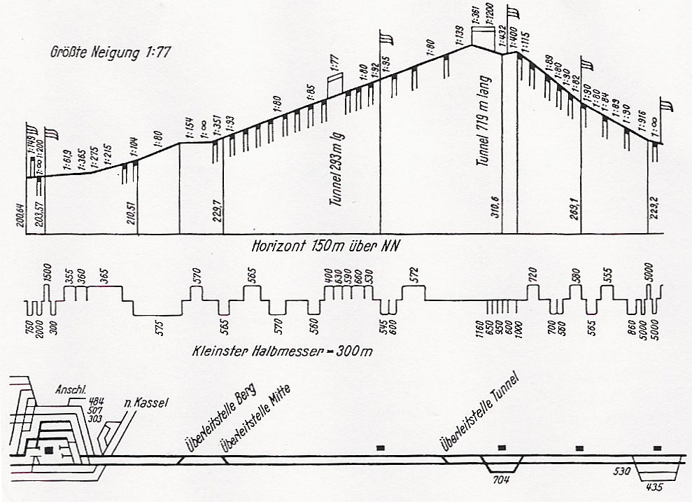 ![]() km 166,630: Höhenprofil der Strecke zwischen Bebra und Cornberg (Quelle: Eisenbahntechnische Rundschau, Heft 12/1951) |