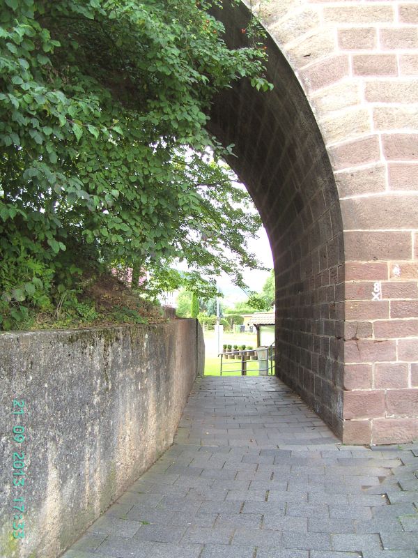 Zwischen Bahnhof und Tunnel ist der Autor leider auf Schätzungen in den Kilometerangaben angewiesen, da entlang der Strecke an den wenigen noch vorhandenen Kilometersteinen jegliche noch erkennbare Beschriftung fehlt.