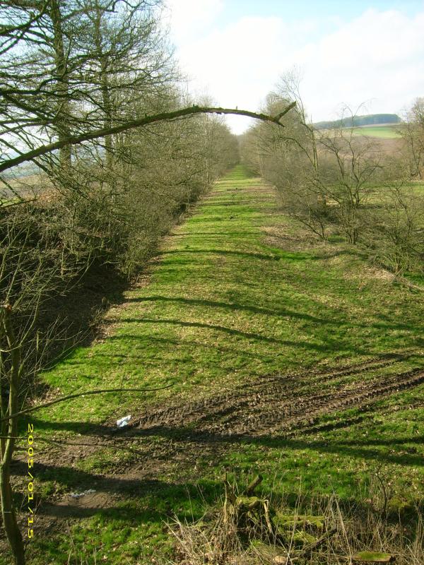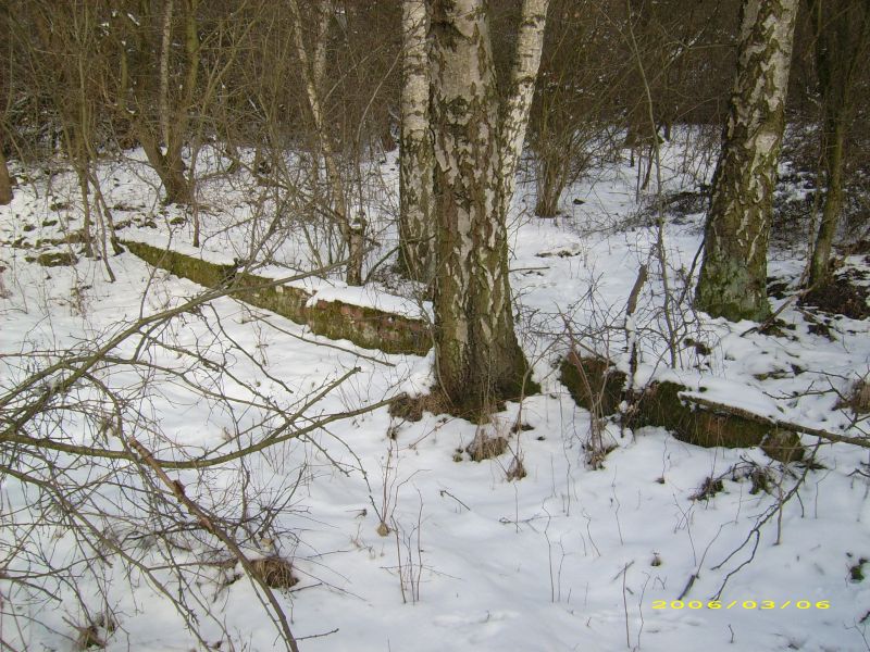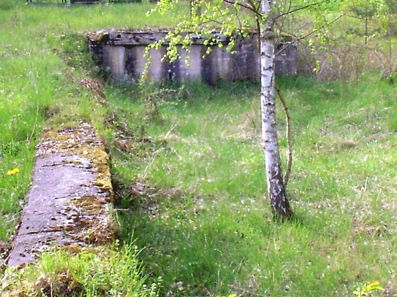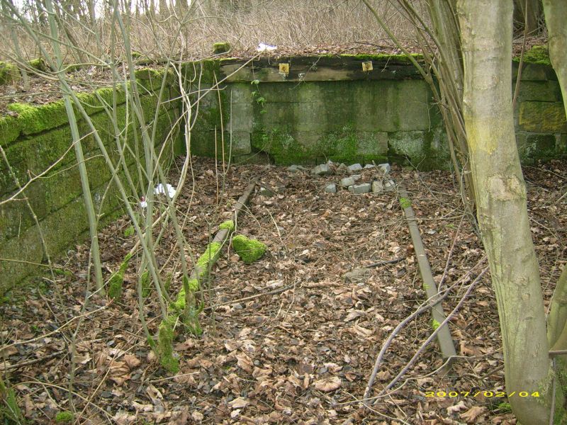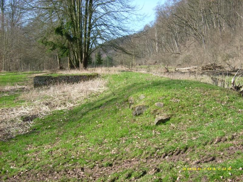 Im Einschnitt treffen wir nach wenigen Metern auf der Südseite auf eine etwa 50 Meter lange Stützmauer, hinter der sich etwa bei km 72,1 alte Grundmauern befinden, die wahrscheinlich von einer ehemaligen Tunnel-Baubude oder sogar von einer Kantine herrühren. Das Gebäude wurde aber vermutlich schon sehr frühzeitig abgebrochen. Im Einschnitt liegt der Schotter noch fast überall, trotzdem ist hier alles ziemlich zu gewachsen, sogar etliche umgestürzte Bäume hindern am Durchkommen entlang der Trasse, aber der ehemalige Verlauf des Schienenweges selbst ist hier noch recht gut zu erkennen. Die letzten Meter der ursprünglichen Trasse im Einschnitt münden heute in eine Kuhweide, die nur während der vegetationslosen Zeit begangen werden kann.