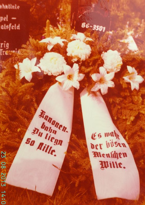 Unsere liebe Kanonenbahn, Schwester des Botenlieschens, geschaffen mit dem Schweiß unserer Urgroßväter, starb im 98. Lebensjahr an einer heimtückischen Krankheit. Wir sind tief erschüttert und können es nicht verschmerzen, dass eine Heilung der Krankheit, die man auch wirtschaftliche Schwindsucht nennt, ausblieb. Durch Einwirkung verschiedener, widriger Umstände wurde die Krankheit höchstwahrscheinlich gefördert. All denjenigen, die auf den Tod hingearbeitet haben, sowie den Vollstreckern, die nach neuesten Berichten auch die Verbindung von Waldkappel nach Eschwege erdrosseln wollen, möchten wir unser Bedauern aussprechen, in dem wir ihnen für ihre grausige Tat politisches Fehlverhalten bescheinigen.