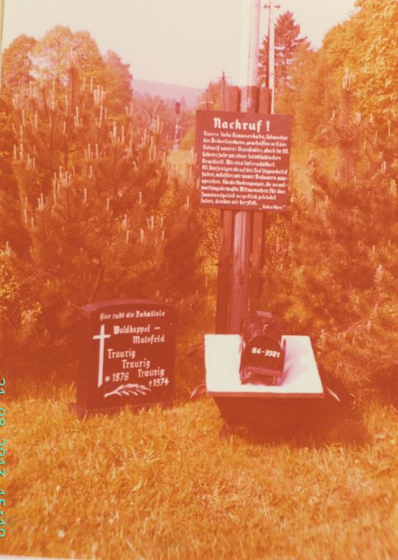So traf sich der Stammtisch am Sonntag, den 19. Mai 1974 um 8:30 Uhr an der Waldkappeler Kirche, um von dort aus mit einem gemeinsamen Trauerzug, an dem auch noch etliche Waldkappeler Bürger teilnahmen, bekleidet teilweise mit schwarzem Anzug, Trauerflor und Zylinder, den Weg zum Bahnhof antraten. Sie marschierten die Leipziger Straße entlang, zogen anschließend noch einmal durch die alte Bahnhofstraße, während die neue schon im Bau war, und bogen zum Schluss in die herrliche Allee ein, die auf direktem Weg zum Bahnhof führt.