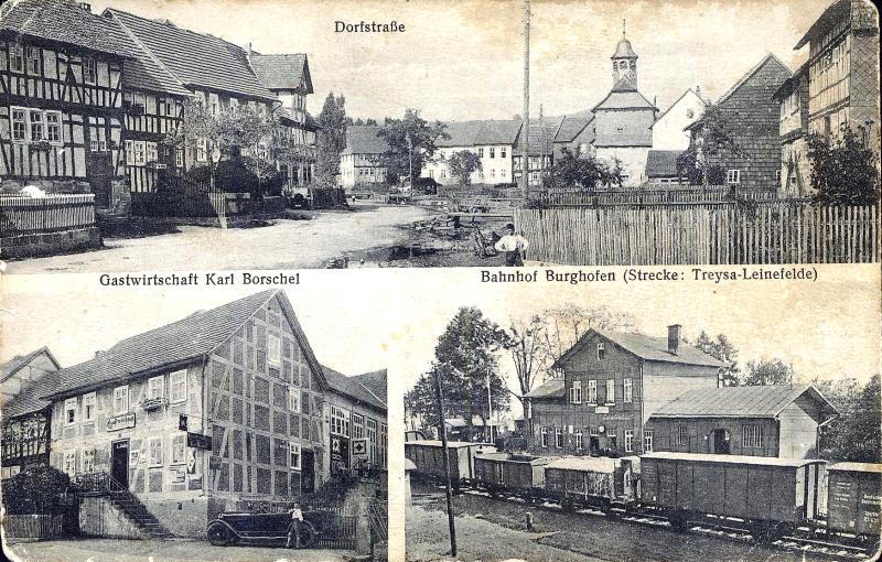 Anfang der 1930er Jahre ließ der Burghofener Gastwirt Karl Borschel eine Postkarte erstellen, auf der nicht nur die Gastwirtschaft, sondern auch eine Dorfansicht sowie der Bahnhof abgebildet wurde. Auf diesem Bild sind eine ganze Reihe heute nicht mehr bekannte Details zu erkennen.