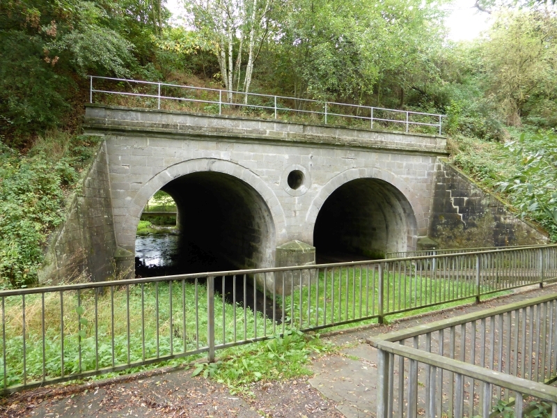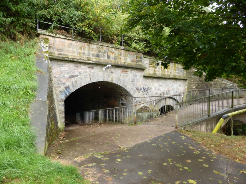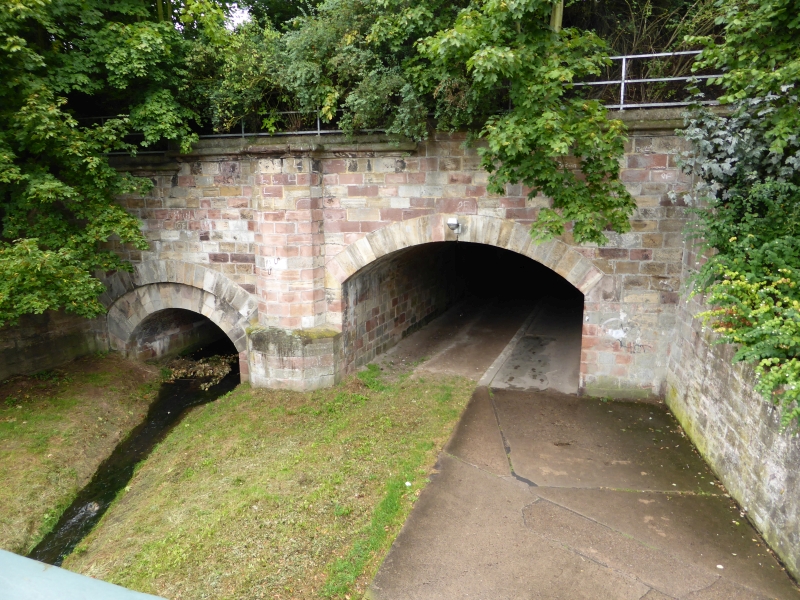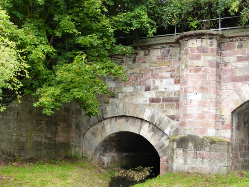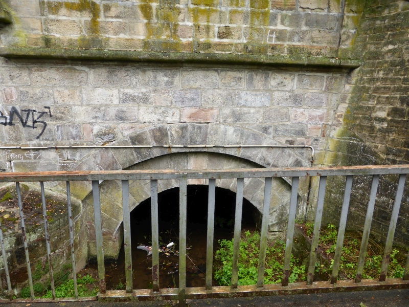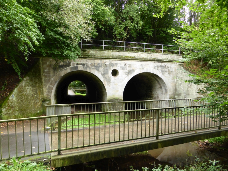 ![]() km 167,050: Fussweg und Fluss Bebra unterqueren die Einfahrt des Bahnhofs Bebra, Westseite (Fotografiert im September 2016) |