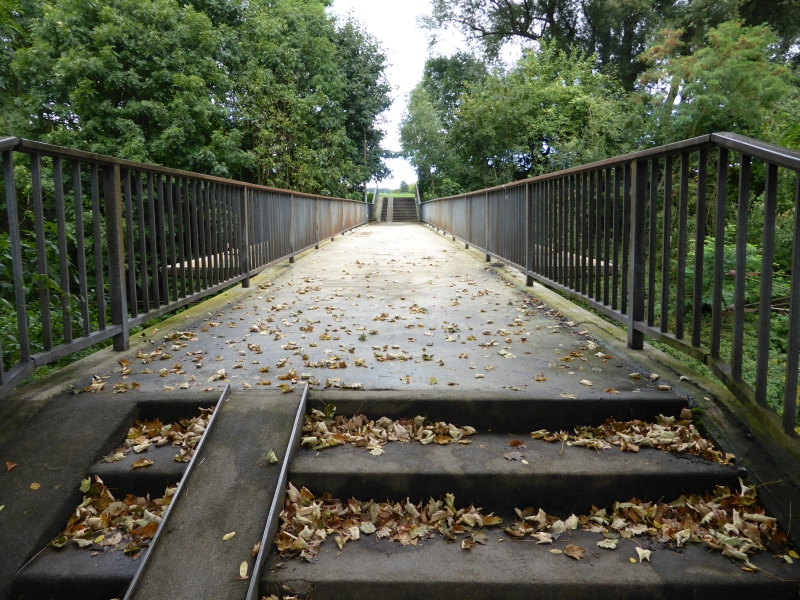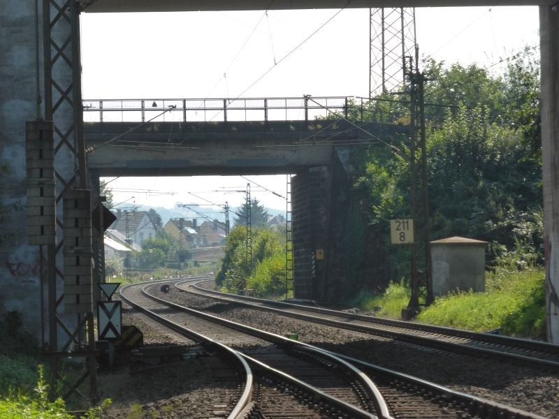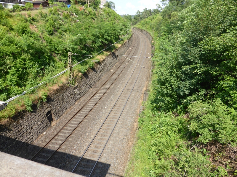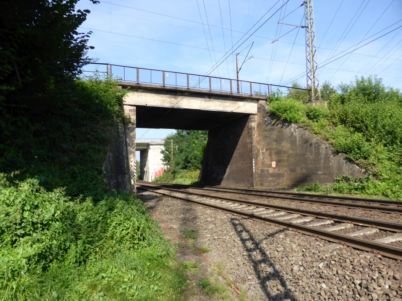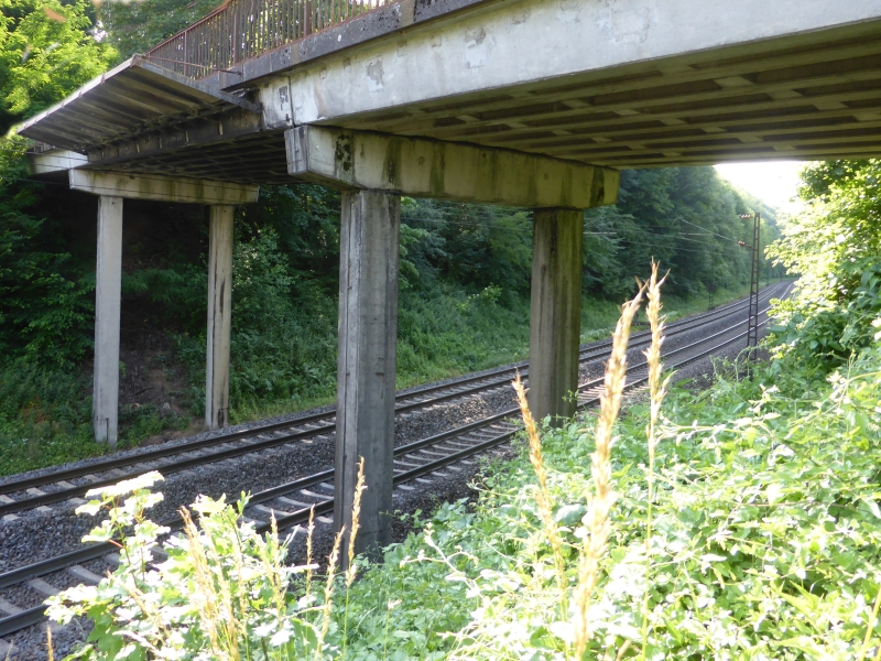 ![]() km 168,940: Blick über Fußgängerbrücke zwischen Heidaustraße und Martholzweg, Südwestseite (Fotografiert im September 2016) |