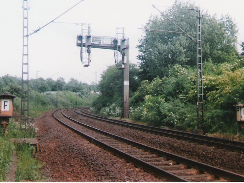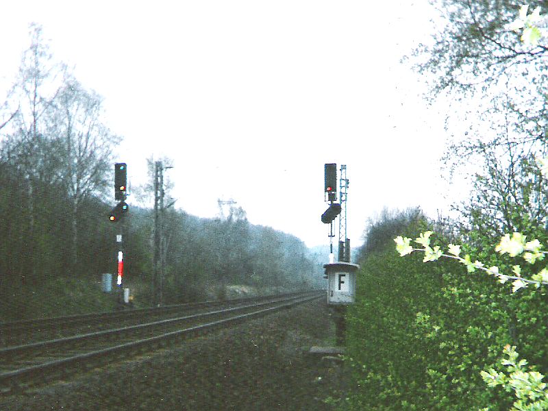 ![]() km 179,685: Das Einfahrtsignal vom Bahnhof Cornberg für die Fahrt auf dem Gegengleis aus Sontra steht auf Hp 2 (Fotografiert in 1985) |