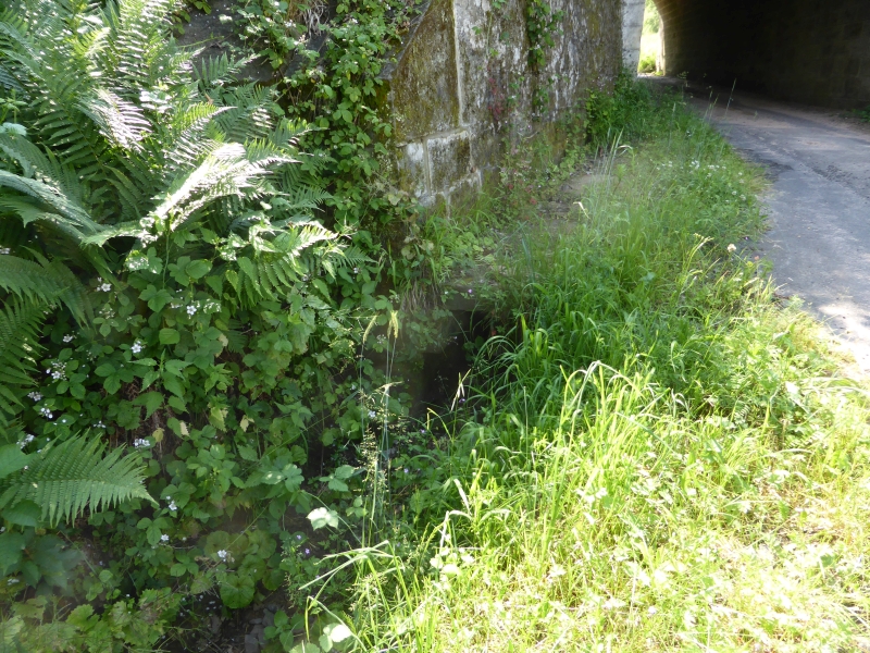 ![]() km 172,466: Seitlicher Wasserdurchlass an Feldwegunterführung, Ostseite (Fotografiert im Juni 2019) |