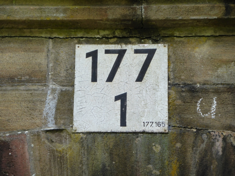 ![]() km 177,165: km-Schild am Feldweg-Unterführung am roten Rain in Rautenhausen, Nordwestseite (Fotografiert im Juni 2016) |