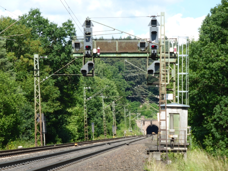 ![]() km 177,759: Signalbrücke für Gleiswechselbetrieb in Richtung Tal, km 177,810: Südportal des Cornberger Tunnels (Fotografiert im Juni 2016) |