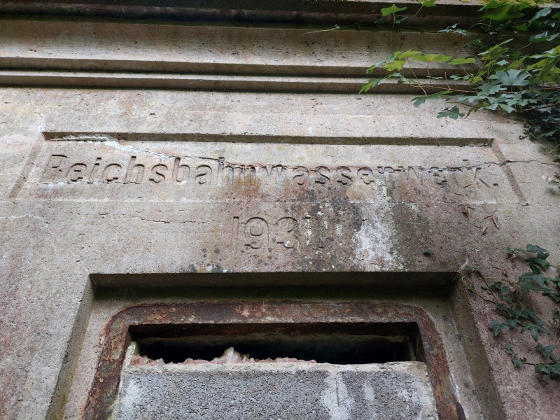 ![]() km 178,770: Inschrift oberhalb der Tür des Reichsbahnwasserwerks, erbaut 1931 (Fotografiert im September 2024) |