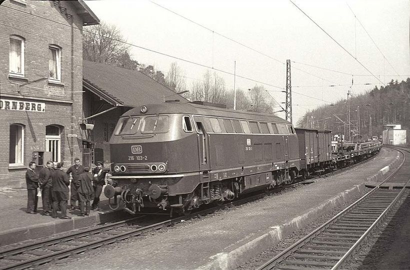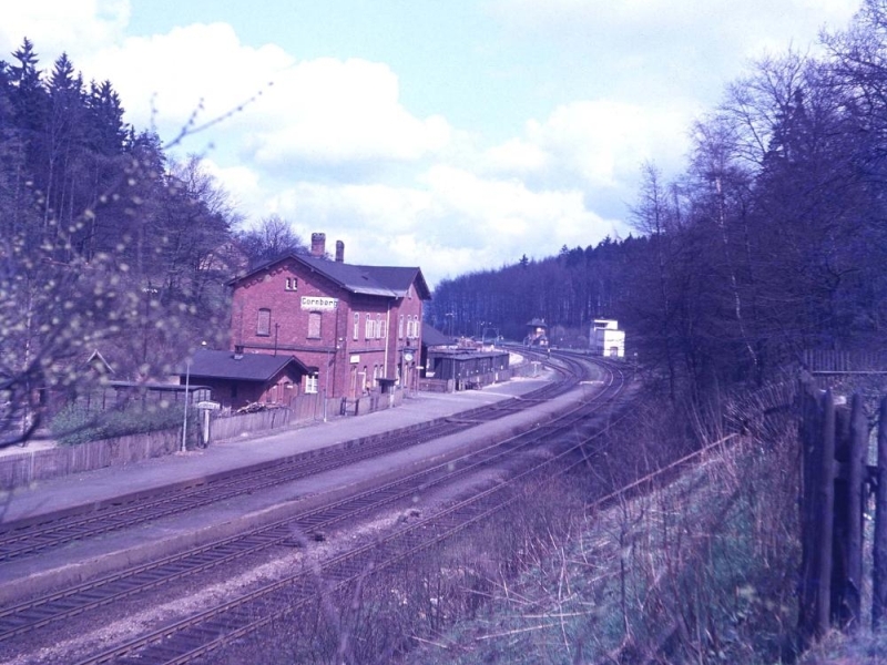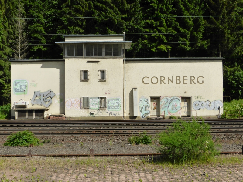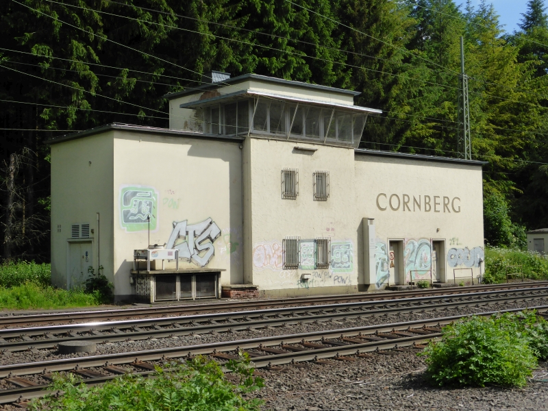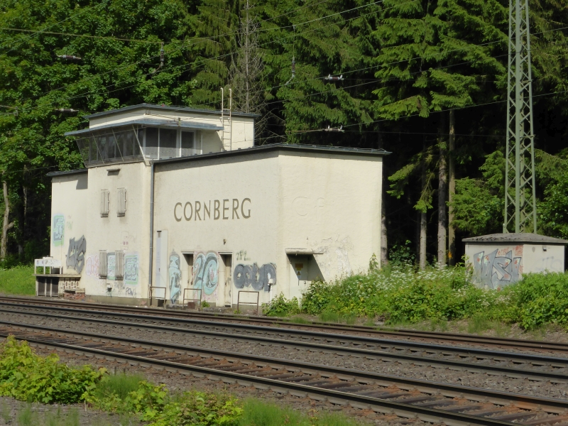 300 Meter vor dem Cornberger Tunnel war das Stellwerk Cs (Cornberg Süd bei km 177,510) mit nebenstehendem Bahnwärterhaus, beide sind heute noch vorhanden. Das Stellwerk war für den südwestlichen Teil des Tunnels zuständig, sowie für das Lokgleis vor dem Tunnel, auf dem die Schubloks einfuhren, um die Richtungsgleise freizuhalten. Gegenüber ist hier heute der Betonschaltkasten der Überleitstelle. Der 719 Meter lange Cornberger Tunnel überwindet die Wasserscheide von Fulda und Werra, die Bahnstrecke geht vom Tal der Bebra in das Tal des Kornberger Wassers, der in den Fluß Sontra fließt. Im Laufe der Elektrifizierungsarbeiten wurde auch dieser Tunnel tiefergelegt. Um den neuen Anforderungen an die Tunnelsicherheit gerecht zu werden, wird eine zweite Tunnelröhre geplant, damit beide Tunnelröhren nur noch in eine Richtung befahren werden und zusätzlich mit einem Fluchtstollen. Alternativ geplant wird auch die Möglichkeit, den Verkehr komplett durch einen neuen Tunnel zu leiten, und den alten Tunnel aufzugeben Kaum aus dem Tunnel, stand rechts das Stellwerk Cm (Cornberg Mitte bei km 178,700), das den südlichen Bahnhofsbereich überwacht hat, seit der Inbetriebnahme des Stellwerkes Cf außer Betrieb und 1969 schon abgerissen war. Etwas weiter links das Empfangsgebäude, in dem es kein Stellwerk gab, des Bahnhofs Cornberg (der Name des Bahnhofes Cornberg wird in topografischen Karten mit C sowie auch mit K geschrieben, der des Ortes immer mit C), wobei der Bahnhof bereits bestand, als der Ort nur 50 Einwohner hatte, wahrscheinlich der Bau aber auch dem nahem Kloster Cornberg und der darin befindlichen Staatsdomäne geschuldet ist. Durch den durch die Nationalsozialisten geforderten Abbau von Kupferschiefer im nahen Richelsdorfer Gebirge, wurde hier ab 1938 eine Bergarbeitersiedlung geschaffen, in der 1944 bereits 2.400 Einwohner lebten. Erst 1954 wurde der Ort Cornberg eine eigenständige Gemeinde im damaligen Landkreis Rotenburg an der Fulda. Der Bahnhof war wahrscheinlich seit 1961 nicht mehr besetzt und wurde nach 1968 abgerissen (wird aber im Gleisplan von 1969 noch aufgeführt), ein Wartehäuschen bot nun den Fahrgästen Schutz. Das nachstehende Bild mit der 216 103-2 vor dem Bahnhofsgebäude beweist das Vorhandensein des Bahnhofsgebäudes mindestens bis 1968. Diese Lok wurde am 31. Januar 1967 als V160 103, Henschel-Fabriknummer 31163, im Bahnbetriebswerk Kassel in Betrieb genommen und am 1. Januar 1968 umgezeichnet, siehe Rolf Wiso's Homepage: Die Diesellokomotiven BR V 160.