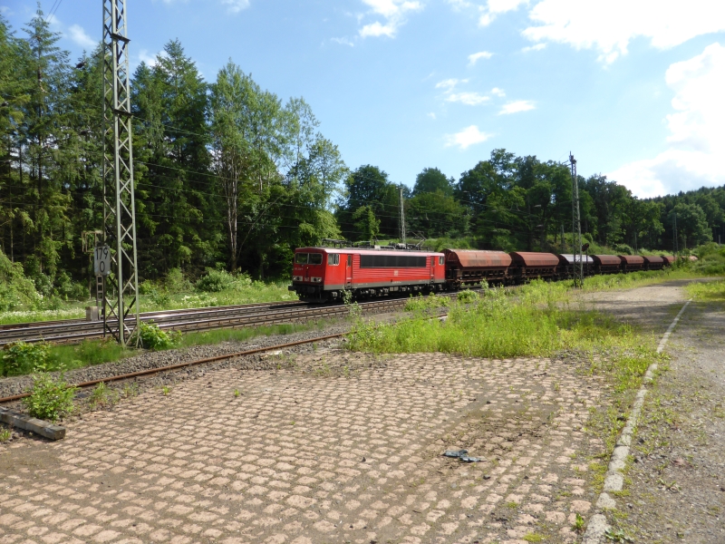 ![]() km 178,840: Güterzug mit 155 239-7 auf Höhe des ehemaligen Bahnhofsgebäudes von Cornberg (Fotografiert im Juni 2016) |