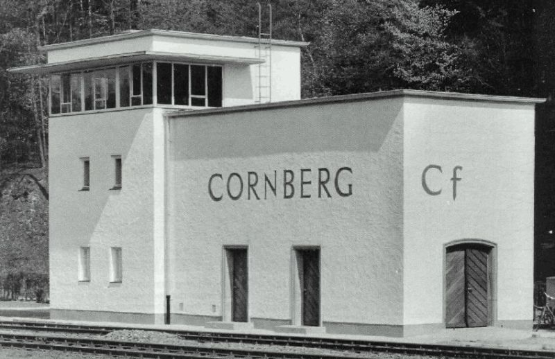 ![]() km 179,050: Stellwerk Cornberg, Südwestseite. Der Anbau, in dem sich das Notstomaggregat befindet, wurde erst in den 1970er Jahren erstellt (Fotografiert in 1951, Sammlung: DB) |