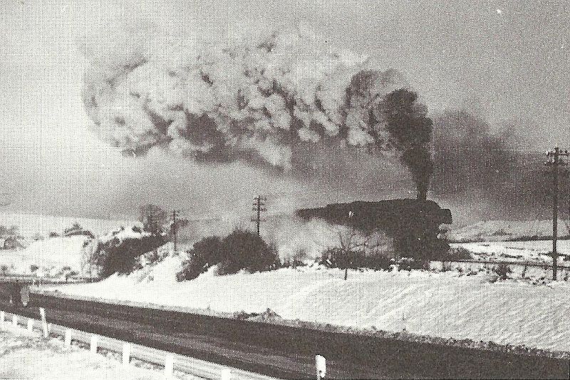 ![]() km 179,900: Güterzug mit Dampflok der Baureihe 44 kurz vorm Einfahrsignal des Bahnhofs Cornberg, daneben die Ende der 1950er Jahren neu gebaute B 27 (Fotografiert um 1961) |