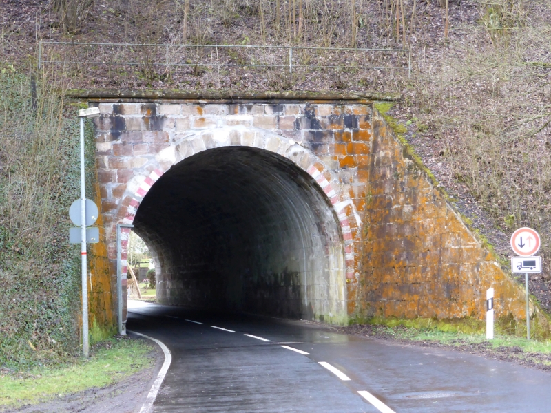 ![]() km 174,550: Portalkopf vom Nordportal des Braunhäuser Tunnels an der K56 zwischen Asmushausen und Braunhausen, die Inschrift lautet: 1873 1875 BRAUNHÄUSER TUNNEL ABGETRAGEN 1962 (Fotografiert im Juni 2016, zur Webseite vom Abtrag des Braunhäuser Tunnels) |