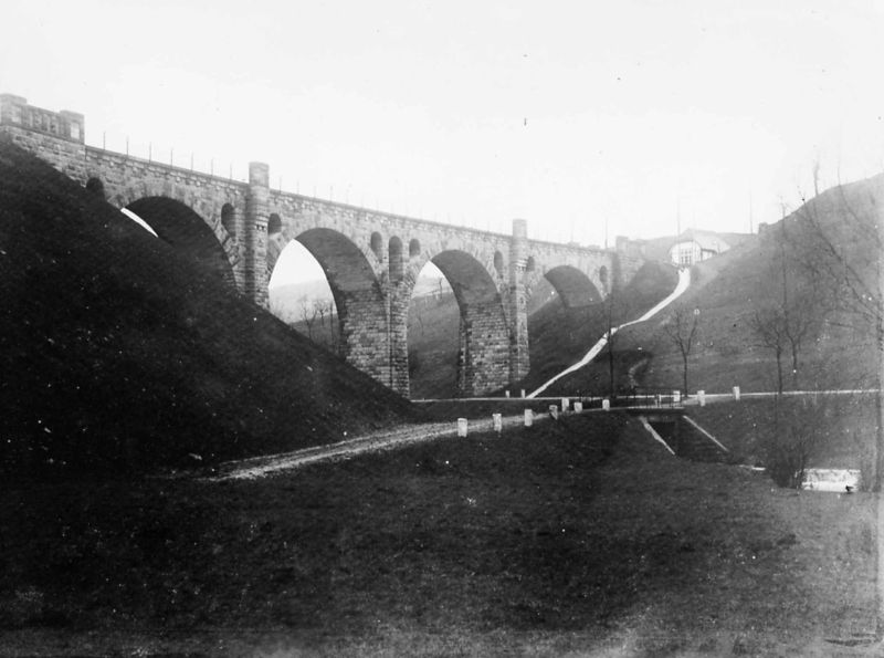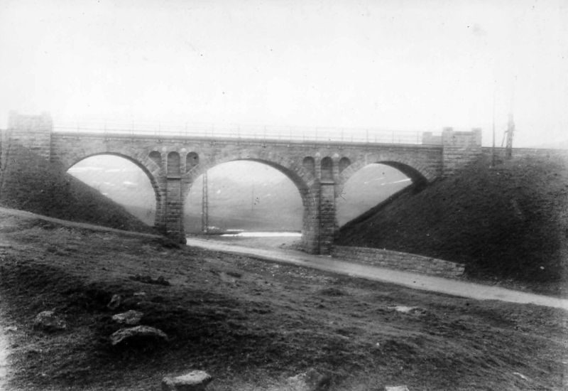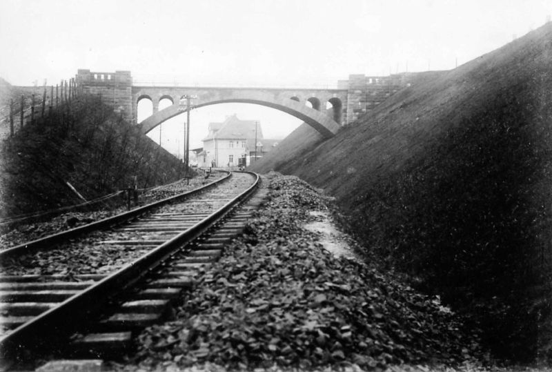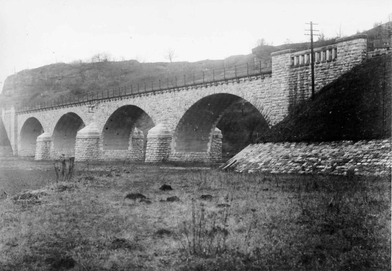![]() km 2,270: Viadukt über die Straße "Weiße Gelster" (K 42) in Laudenbach, Ostseite (Fotografiert in 1915 von Ernst Schlie / Sammlung Dr. D. Ahlborn) |