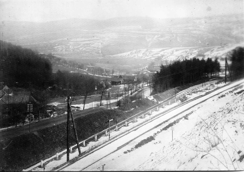 ![]() km 15,400: Strecke vor Carmshausen, welches auch einen Bahnhof oder einen Haltepunkt erhalten sollte, Südseite (Fotografiert in 1915 von Ernst Schlie / Sammlung Dr. D. Ahlborn) |