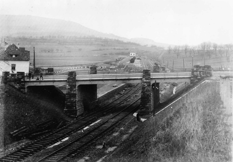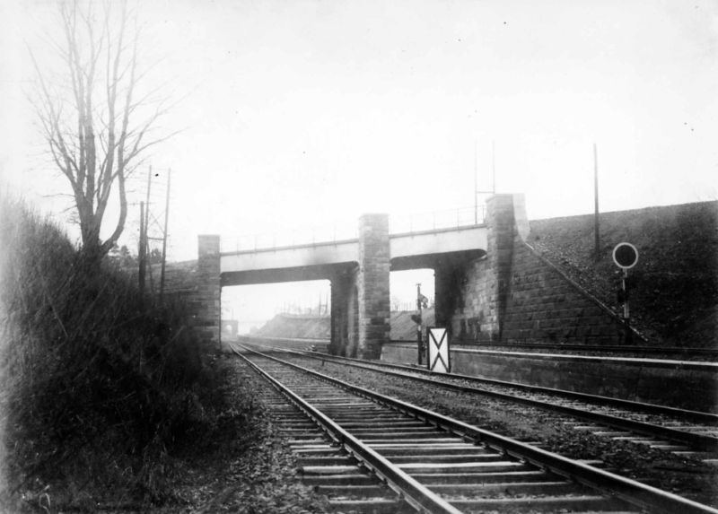 ![]() km 22,740: Brücke der ehemaligen B 27, Nordwestseite, im Hintergrund ist die Nord-Süd-Strecke zu erkennen (Fotografiert in 1915 von Ernst Schlie / Sammlung Dr. D. Ahlborn) |