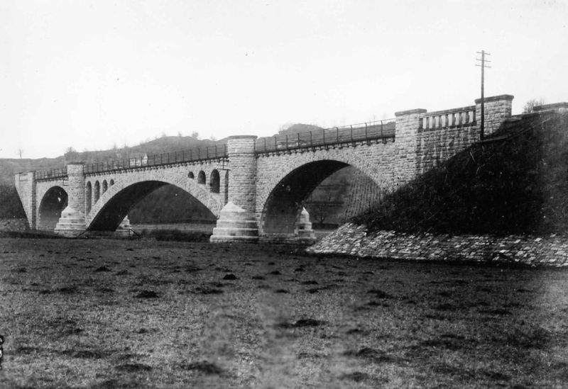 ![]() km 23,560: Brücke der B 80, Nordseite, im Hintergrund Schloss Arnstein (Fotografiert in 1915 von Ernst Schlie / Sammlung Dr. D. Ahlborn) |