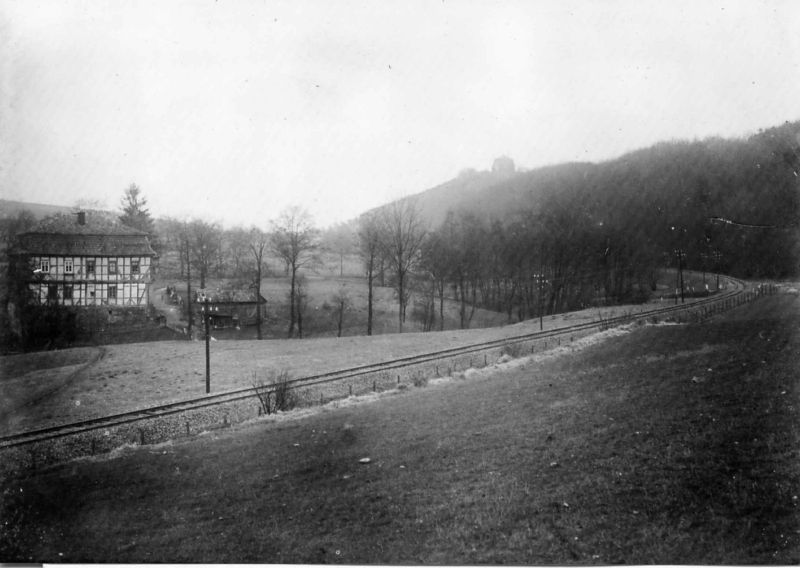 ![]() km 7,750: Trasse bei der Thomasmühle (vorn) und der Erbsmühle (hinten) (Fotografiert in 1915 von Ernst Schlie / Sammlung Dr. D. Ahlborn) |